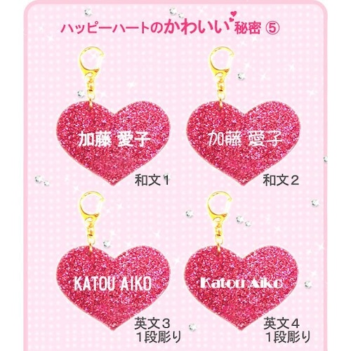 ネームプレート、ネームタグ「ハッピーハート」お名前彫刻付き